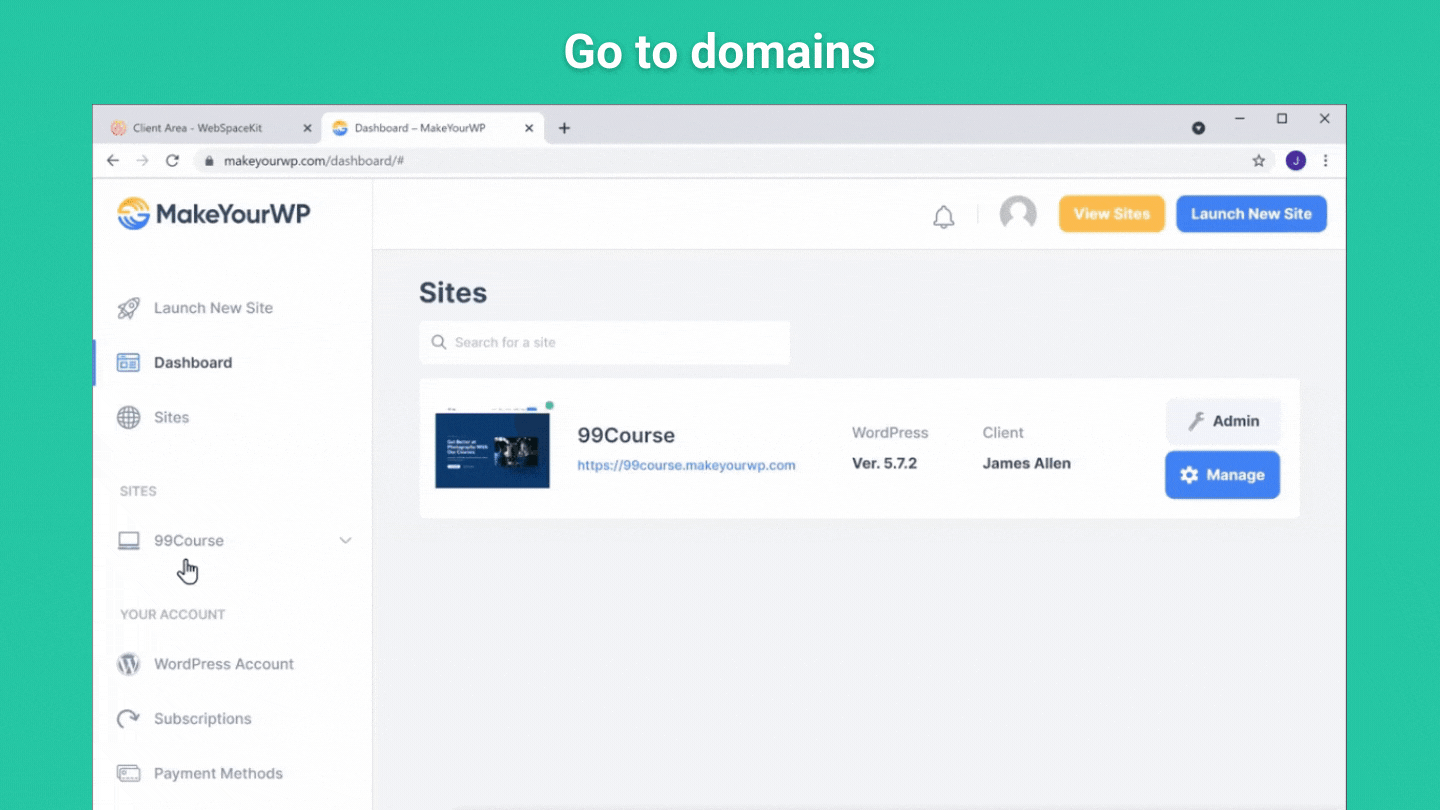 To add your course content to the site, you need to log in to your site. To do that, go to your ‘MakeYourWP’ account and to the admin area.