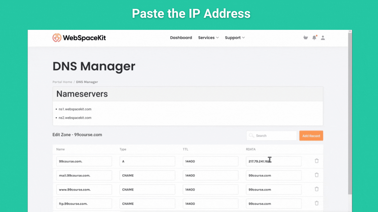 To add the IP Address, go to domains on your WebSpaceKit account,
