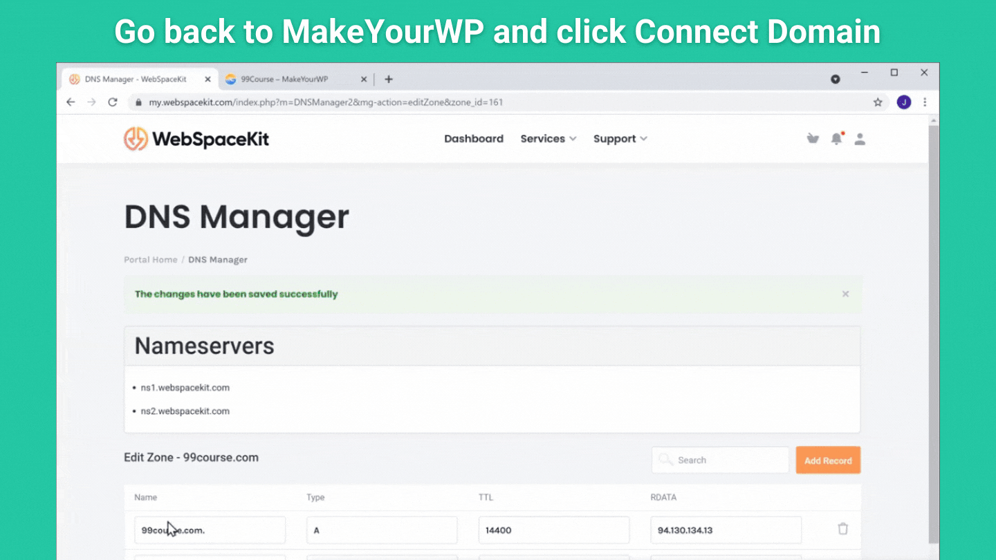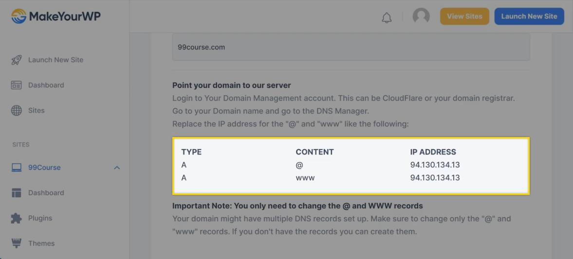 Here next to the ‘A’ record, you need to add your IP address from the MakeYourWp page,