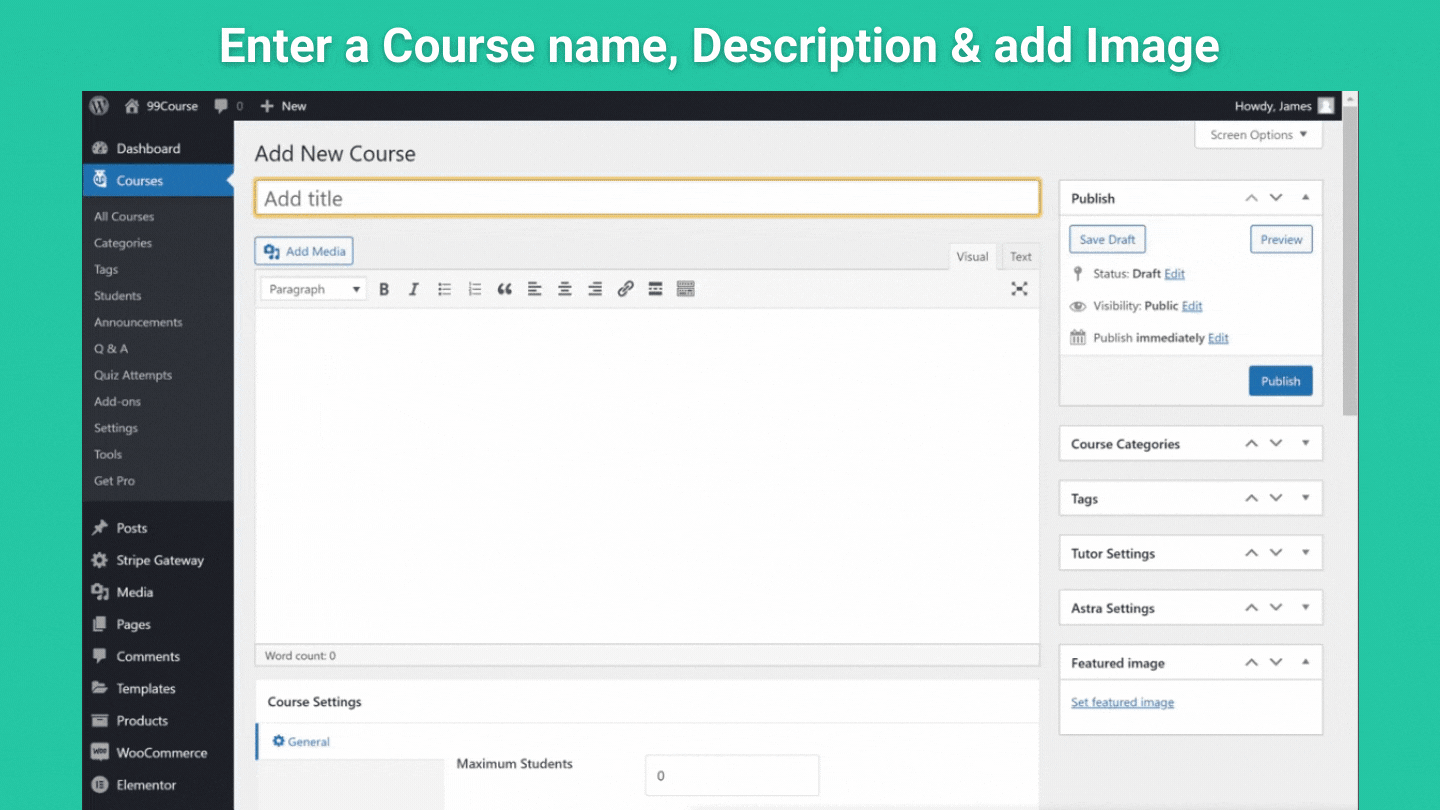 Here enter the course name that you created your course with and enable the option ‘For Tutor.’