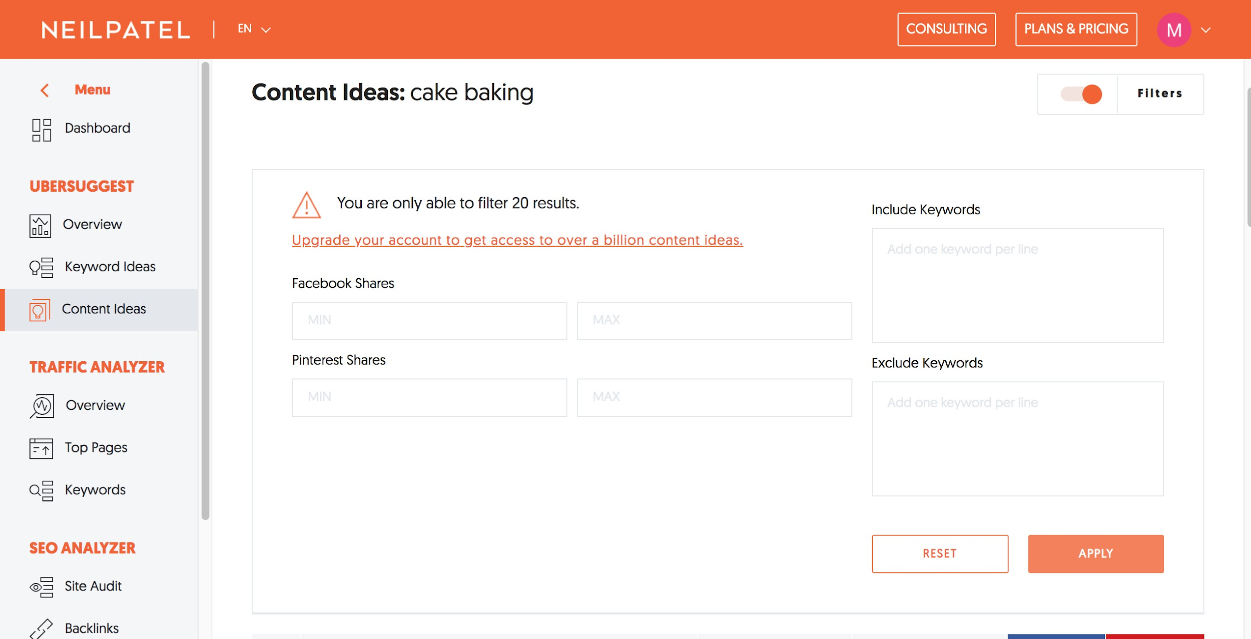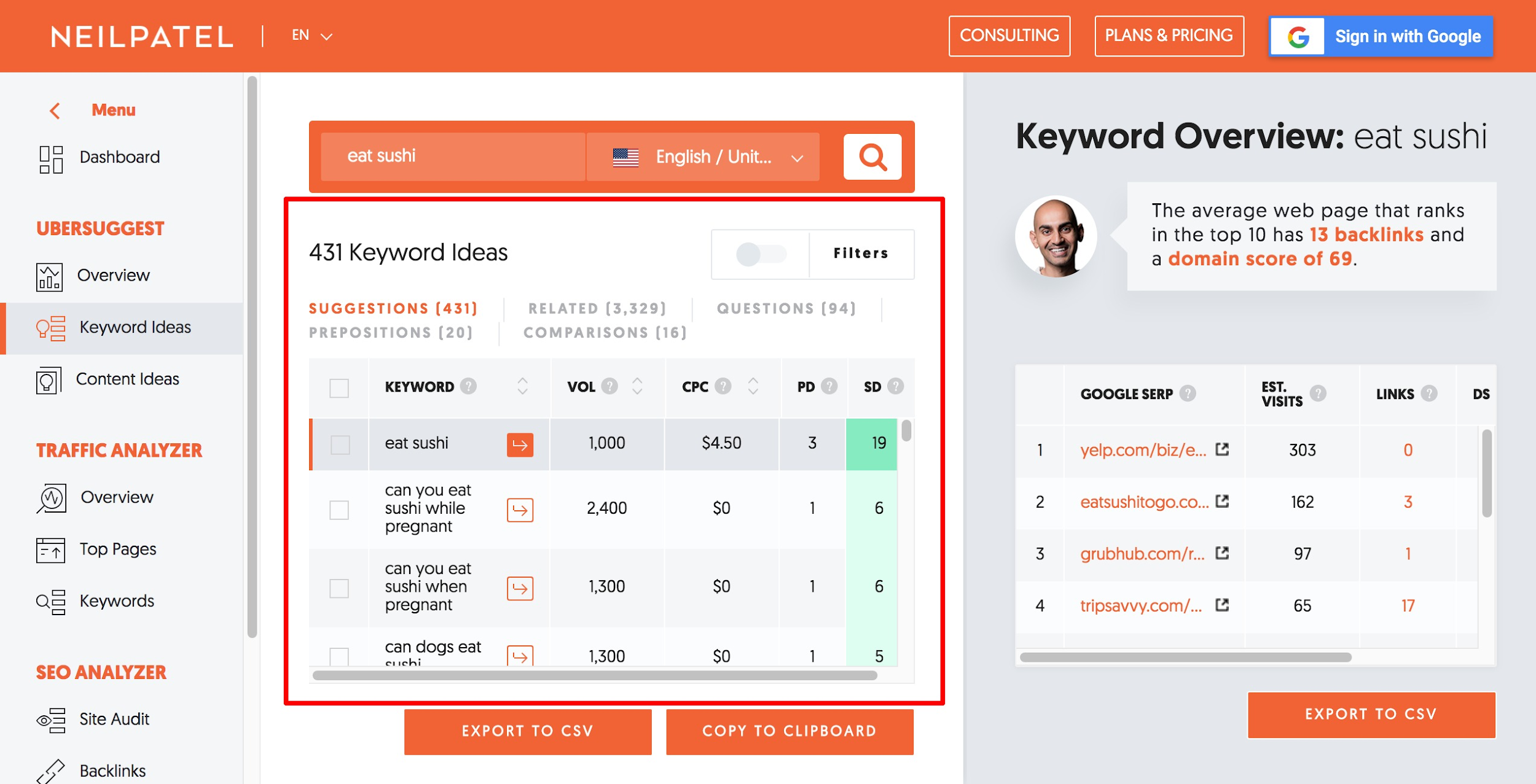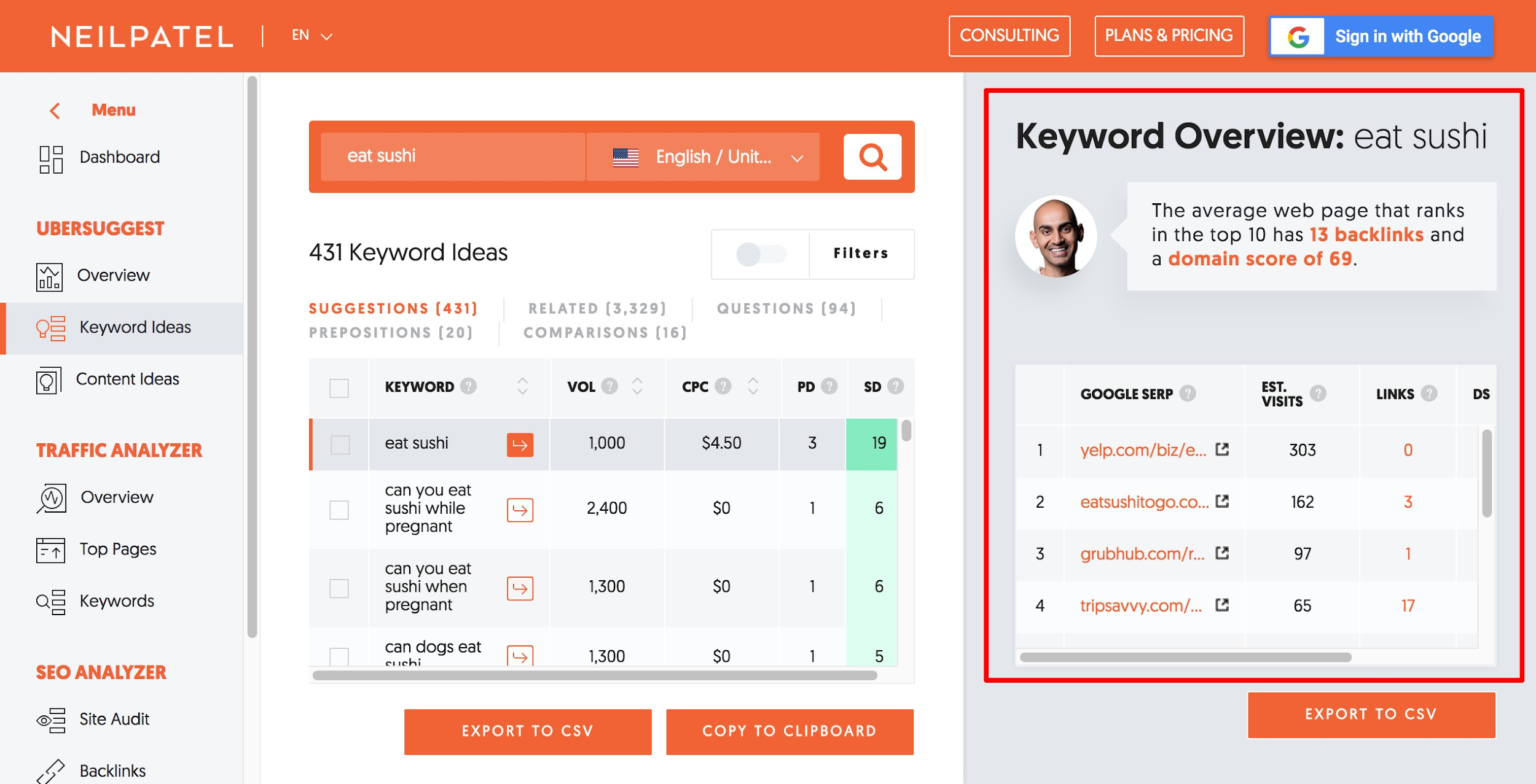 To get more data out of Ubersuggest, sign up for free or get one of their affordable paid subscriptions.