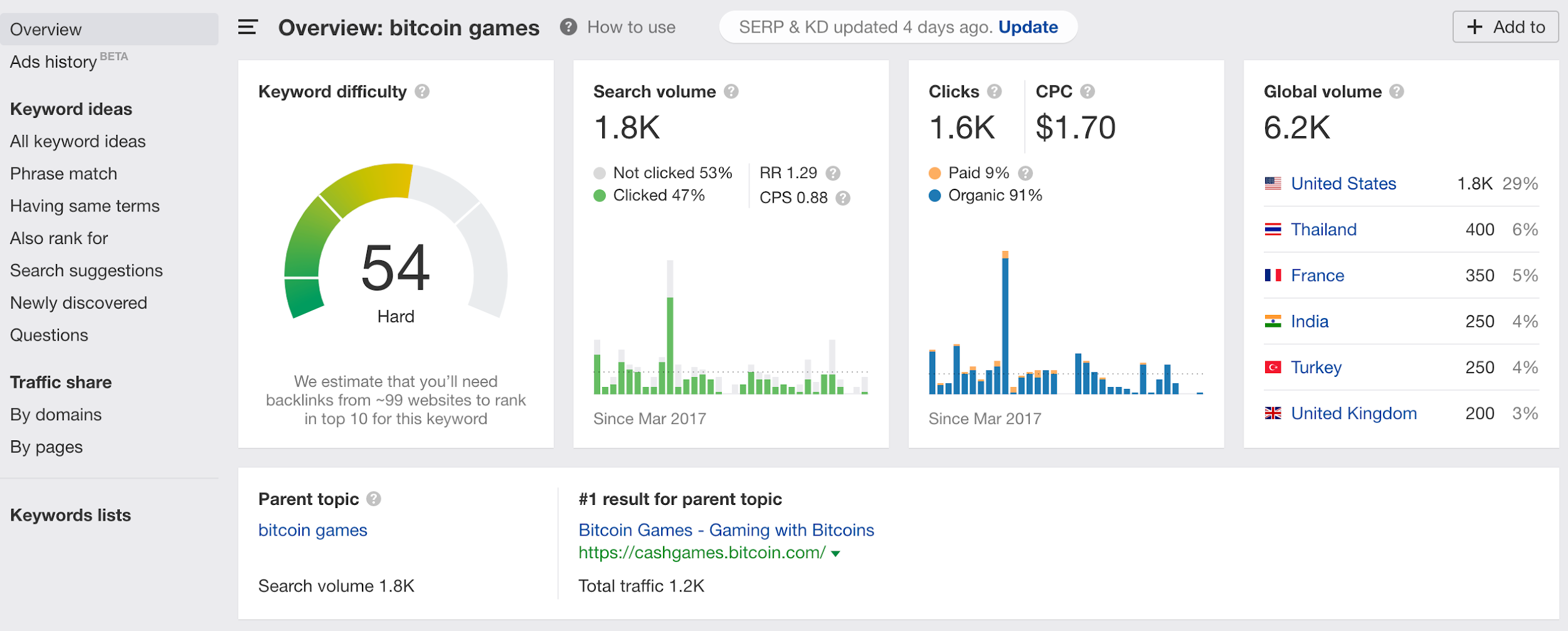 Your results also show a Parent Topic which is unique to Ahrefs. A Parent Topic identifies a broad but high-performing keyword that you can use to rank for your target keyword.