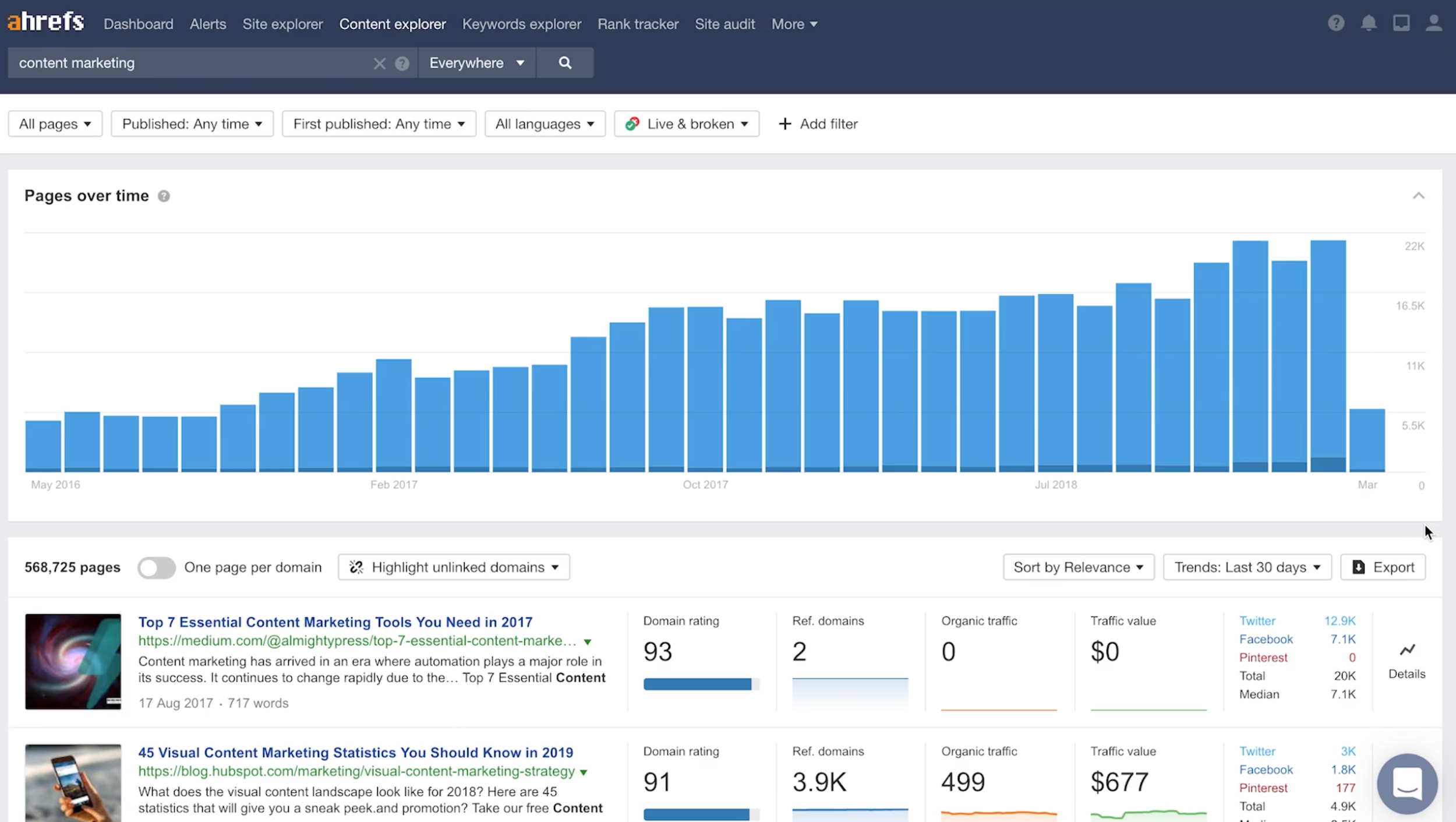 The Content Explorer also lets you filter your results by date, language, domain, social share, and more. The detailed filter is one of Ahrefs’ unique features.