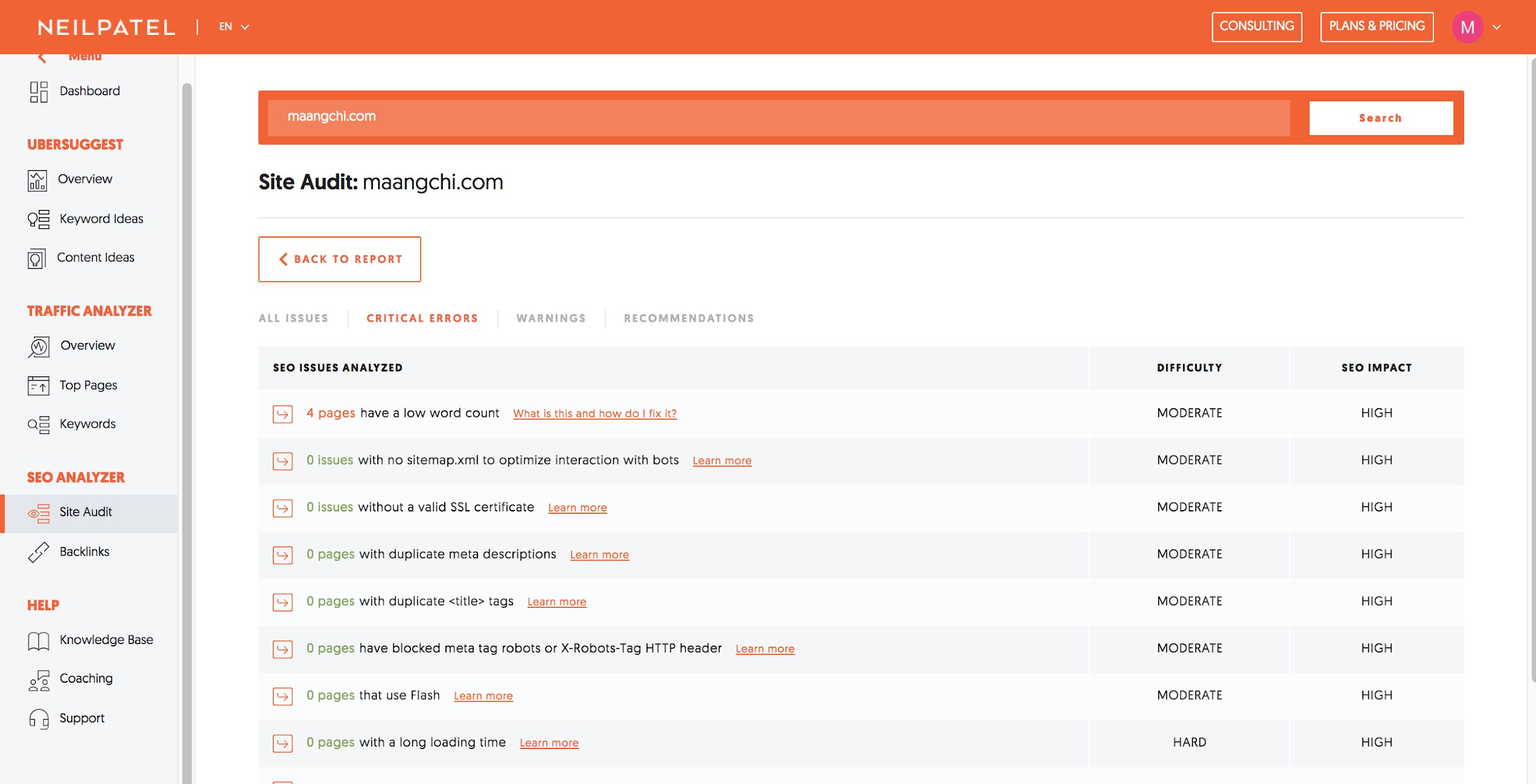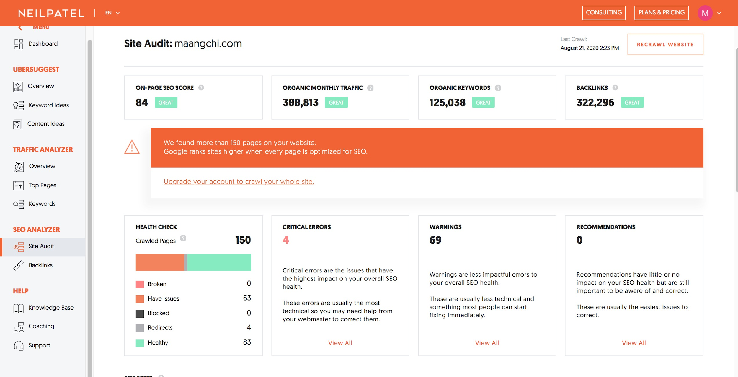 Ubersuggest’s in-depth site audit crawls up to 150 pages of a website for free in just a few minutes.