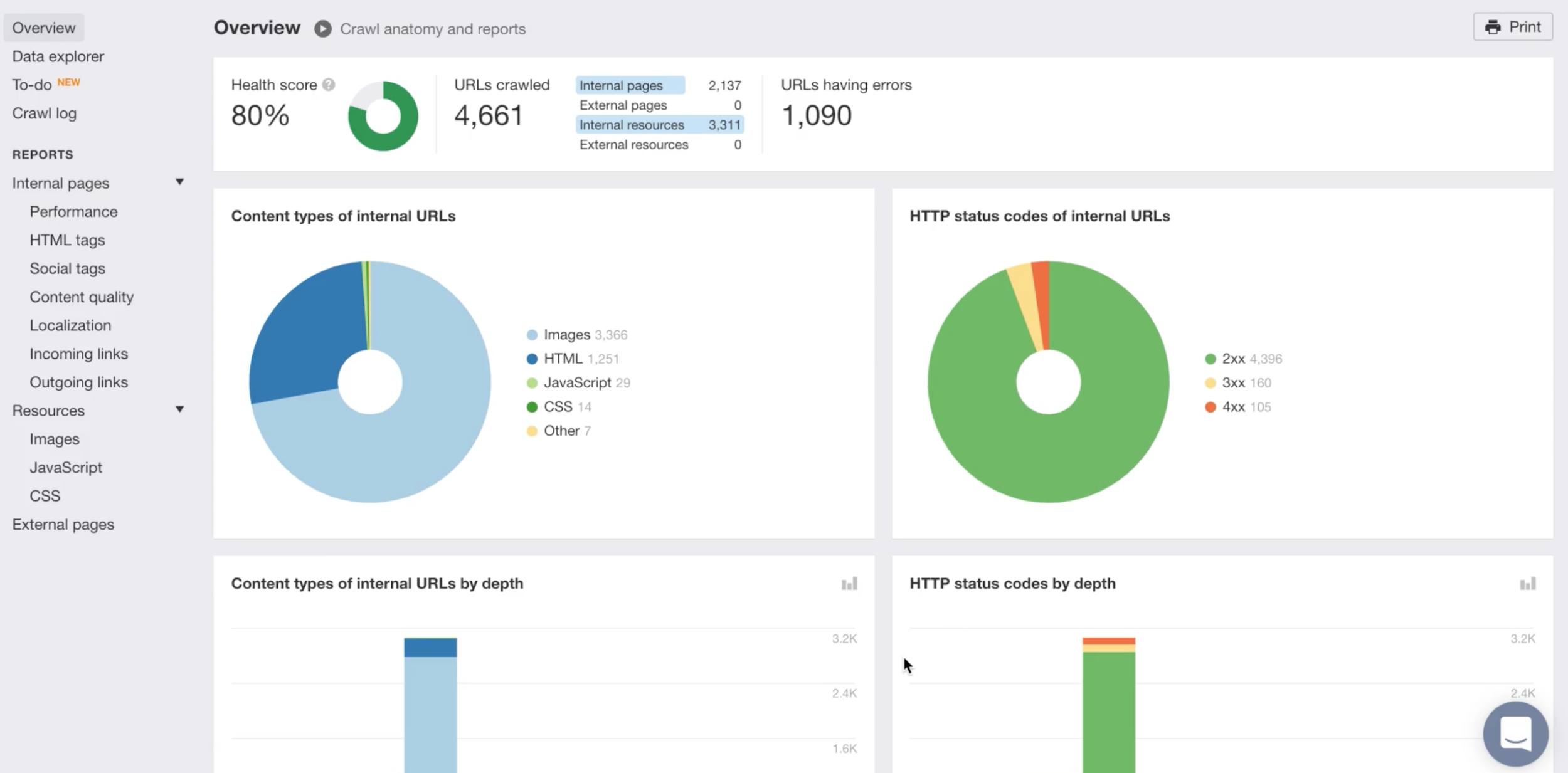 Similar to Ubersuggest, Ahrefs’ Site Audit feature provides your overall SEO health score, key metrics, SEO errors, and recommendations.